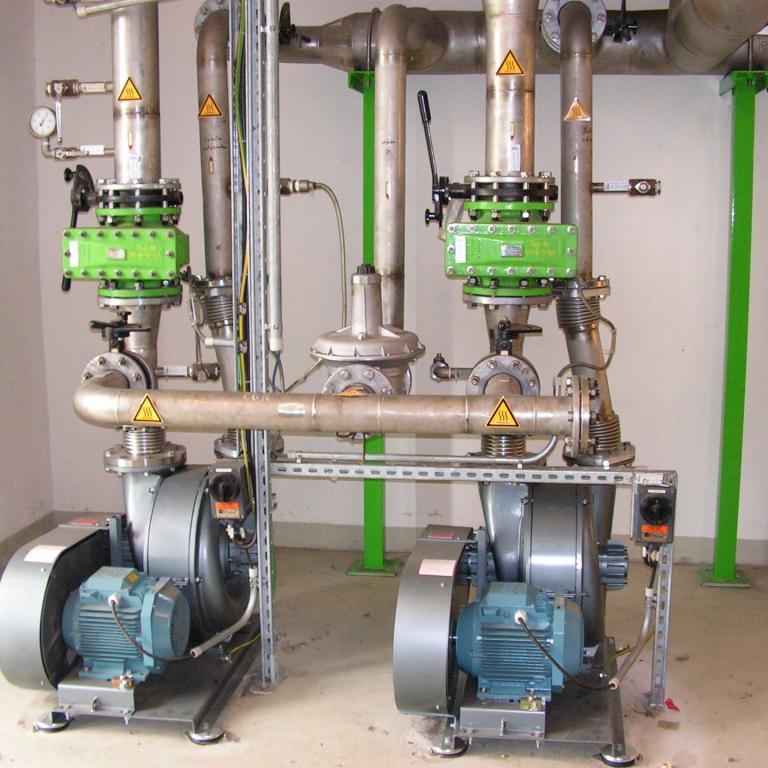 Bei der pneumatischen Förderung erzeugt ein Gebläse oder Exhaustor einen gleichmäßigen Luftstrom, der das Schüttgut fließfähig macht, damit es aus dem Behälter strömen kann. In Vielen Anwendungen in diesem Bereich ist ein Explosionsschutz unabdinglich.